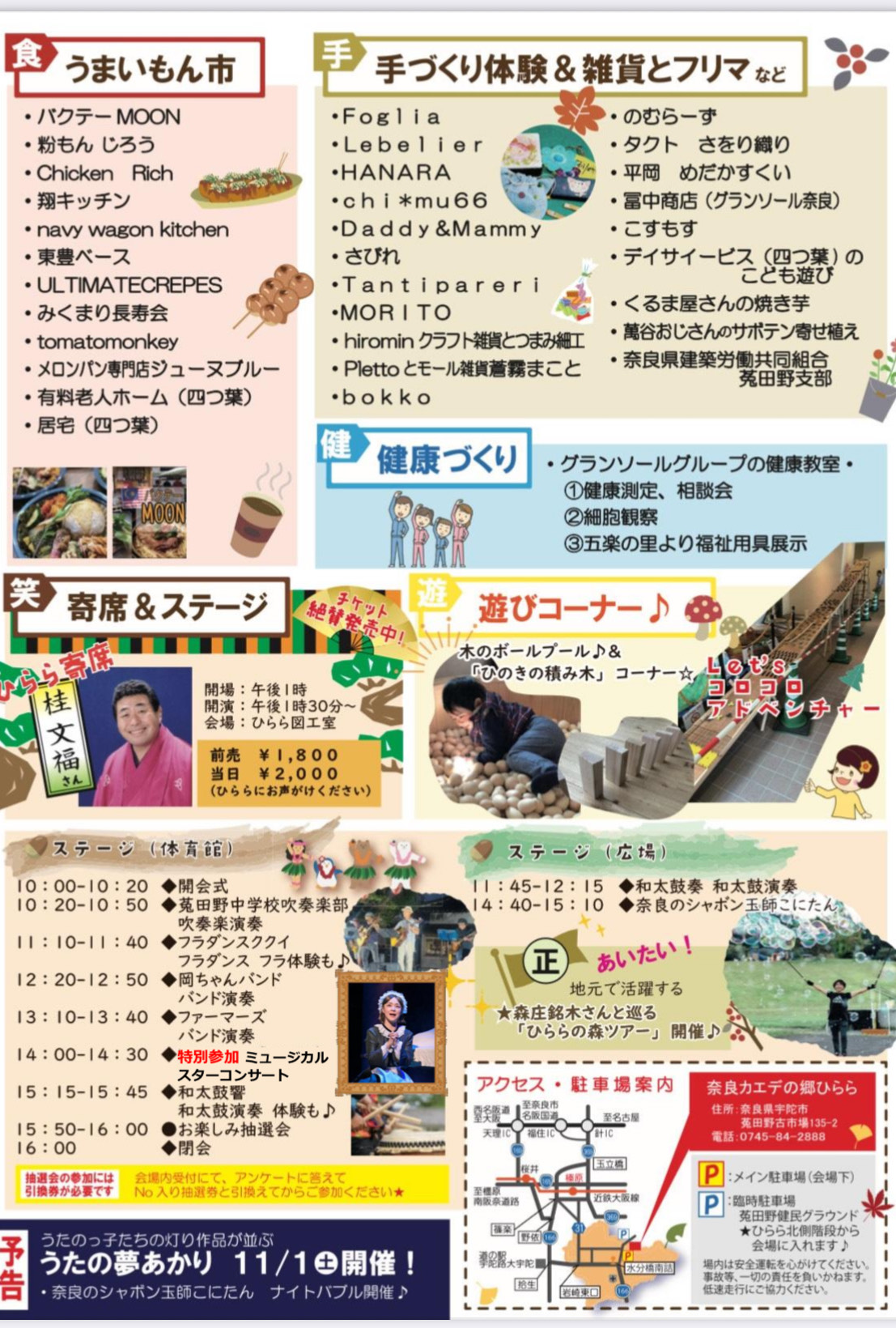 | 本施設はペット同伴でのご来園は 硬くお断りいたします。 またペット専用教室は廃止いたしました。 INFO 2025 12/24(水) 勝手ながら年末年始は 12/24(水)~1/6(火)まで休園させて いただきます。 1月7日(火)より通常開園させて いただきます。 1月、2月は月曜、木曜が定休日で 営業時間は9:00~16:00となります。 メールでのお問い合わせは返信に 時間がかかる場合がございますので お急ぎの場合は電話でお問い合わせ くださるようお願いします。 12/9(火) 本日勝手ながらcafeカエデを 臨時休業させていただきます。 11/11(火) 当サイトとゲストハウスのサイトを 統合しました。 統合に伴いゲストハウスの info@hirara.main.jp のアドレスは 廃止になります。 今後は info@udakaedenosato.main.jp へお願いします。 9/19(金) 輝けうたの!出演者変更のお知らせ 14時からの穐田和恵さんの 体調不良のため出演者が変更になりました 14時からは「ライオンキング」 「キャッツ」「アニー」等の名作に 出演されている高橋 卓士さん、 遠山さやかさん、小笠真紀さんの ミュージカルスターコンサートに 変更になりました。 お子様からシニアまで楽しめる名曲の 数々をぜひお楽しみください。 ![]() 9/19(金) 9月21日(日) 10:00~16:00 輝けうたの!が開催されます ぜひおこしください ![]() ![]() ![]() ![]() 6/21(土) cafeカエデのメニューが一部変更に なりました。 ランチのラスタオーダーが14:00に なりました。 営業時間 ランチ 11:00~14:00 Cafe 11:00~15:30 4月12日(土) 誠に勝手ながら 4月中はcafeカエデの給食ランチは 中止とさせていただきます。 5月より第2、第4日曜の提供と させていただきます。 30食限定で1,200円です。 よろしくお願いします。 3月11日(火) cafeカエデのメニューがかわります。 2月18日(火) 臨時休業のお知らせ 勝手ながら2月26日(水)~28日(金) までcafeカエデのみ臨時休業させて いただきます。 3月1日(土)より通常営業いたします。 まお校舎、カエデ公園は通常通り 営業いたしております。 INFO 2024 12月4日(水) 勝手ながら年末年始は 12月25日(水)から1月6日(月)まで 休園させていただきます。 1月7日(火)より通常開園させて いただきます 12月20日(金) 11月20日に 地域創生アンバサダープロジェクト 地域創生アンバサダーの えなこさん、えい梨さん、 篠崎こころさんに記念植樹して いただきました。 ![]() ![]() ![]() ![]() 11月3日(日) 輝けうたの が開催されます 10時~16時 桂 文鹿さんの寄席もあります ![]() ![]() ![]() 04/01 ・カフェのメニューが一部変更になりました INFO 2023 09/28 ・おかげさまで奈良カエデの郷ひららは 開園10周年をむかえることができました。 10周年記念事業としまして 10月8日(日)に当園でイベントを行います。 ぜひご来園ください 10月8日(日) 10:00~12:00 記念式典 特別講演 13:30~15:00 ひらら寄席(桂 文鹿 他) ¥2,000 50名限定 11:00~16:00 フリーマーケット 11:00~16:00 コスプレ大集合 04/27 cafeカエデ ・この度は、原材料の高騰に伴い、5月1日より メニューの価格変更を致します。 日頃より当店をご利用いただいております皆様に おかれましては、何卒ご理解くださいますよう お願いいたします。 これからも、皆様に愛される店であり続けられま すよう、サービスの向上に努めてまいりますので 是非変わらぬご愛顧をお願い申し上げます。 INFO 2022 09/15 ・cafeカエデのメニューが新しくなりました 04/08 ・cafeカエデが4月12日火曜日11:00~ リニューアルオープンいたします。 ぜひおこしください。 cafeカエデ ![]() ![]() ![]() ![]() ![]() INFO 2021 08/06 ・虹が綺麗でした。 ![]() 05/14 ・BBQガーデンがオープンしました。 http://hirara.main.jp/ ・ |